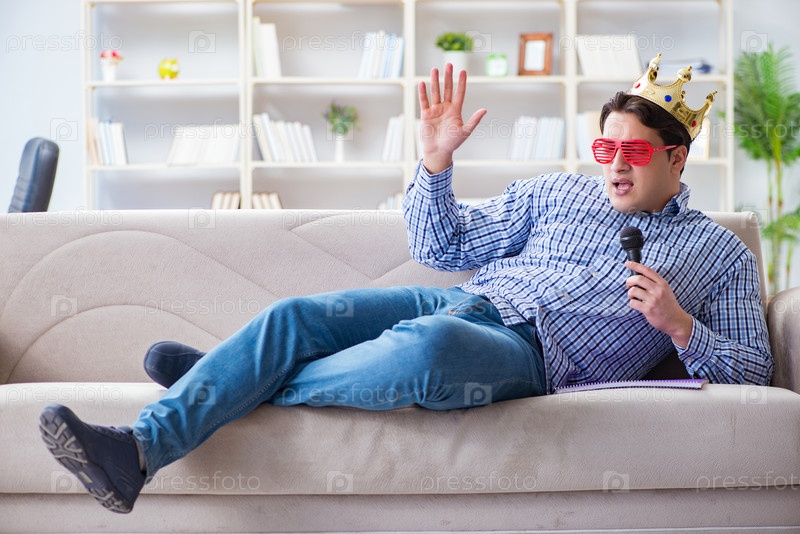 Забавный мужчина поет песни на караоке дома