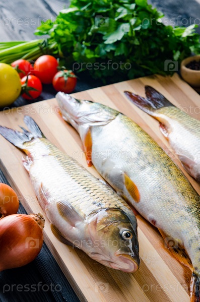 Сырая рыба на режущей доске в концепции приготовления пищи