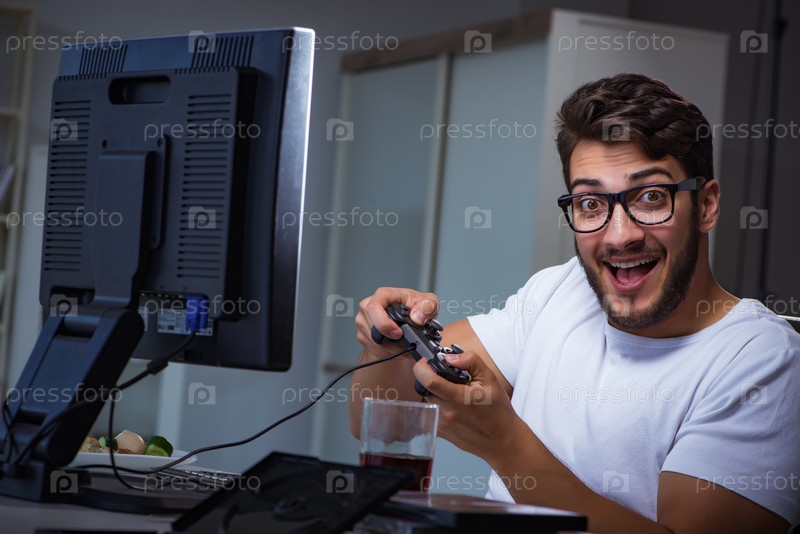 Молодой человек играет в игры долгие часы поздно вечером в офисе