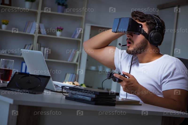 Молодой человек играет в игры долгие часы поздно вечером в офисе