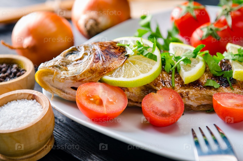 Жареную рыбу подают на тарелке