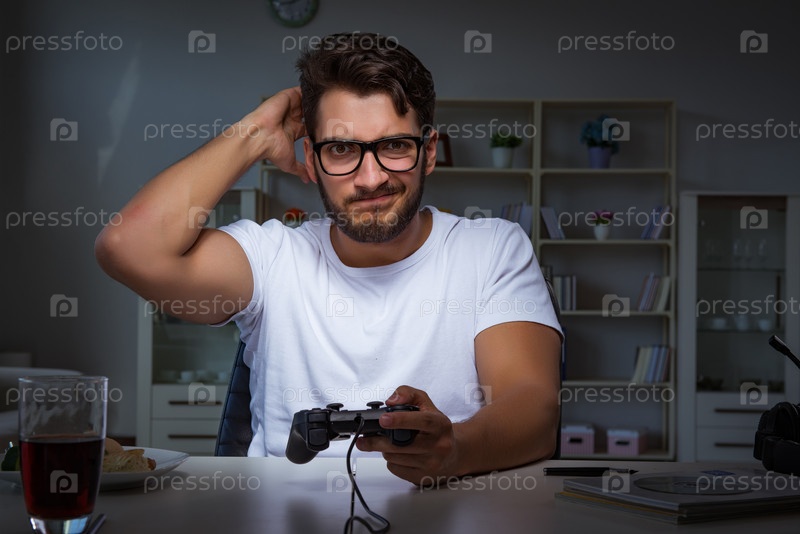 Молодой человек играет в игры долгие часы поздно вечером в офисе