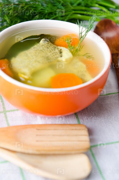 Рыбный суп подают на стол в тарелке