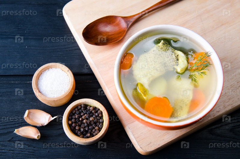 Рыбный суп подают на стол в тарелке