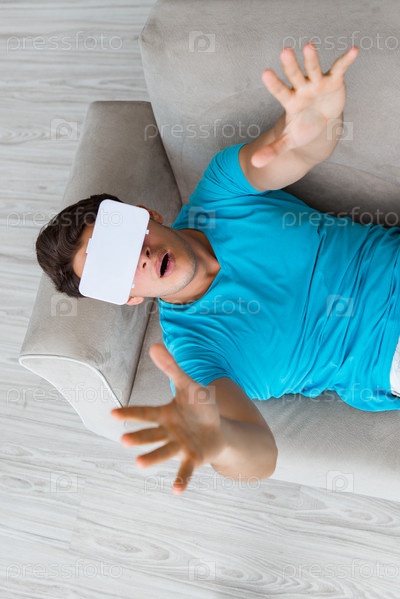 Молодой человек в очках VR отдыхает на диване