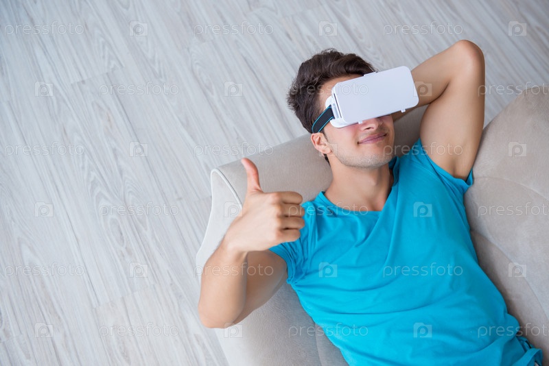 Молодой человек в очках VR отдыхает на диване