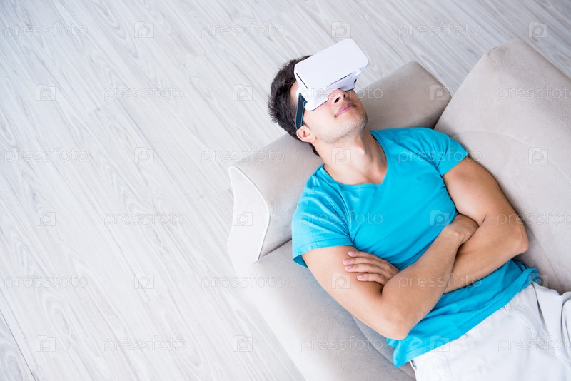 Молодой человек в очках VR отдыхает на диване