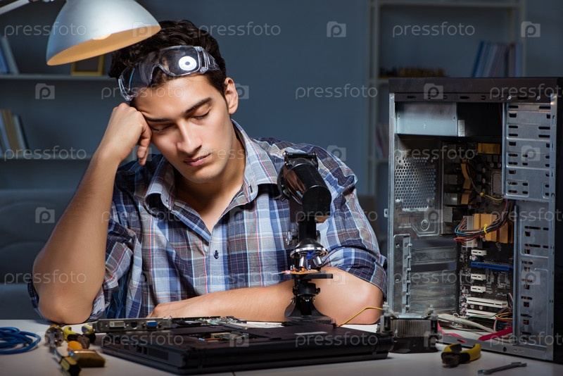 Ремонтник пытается починить ноутбук с помощью микроскопа