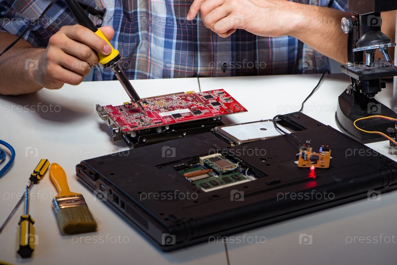 Молодой техник по ремонту заполняет электрические детали на материнском борде