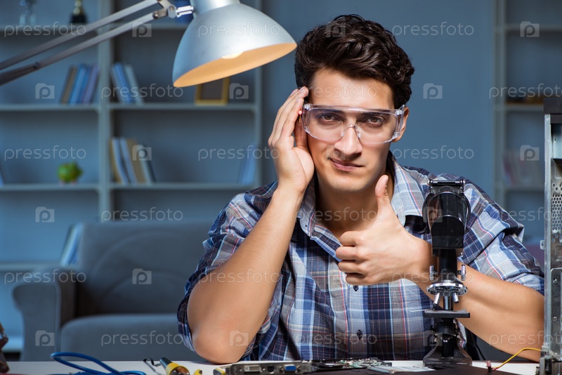 Ремонтник пытается починить ноутбук с помощью микроскопа