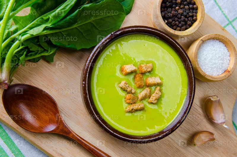 Суп из шпината, подаваемый на деревянной доске