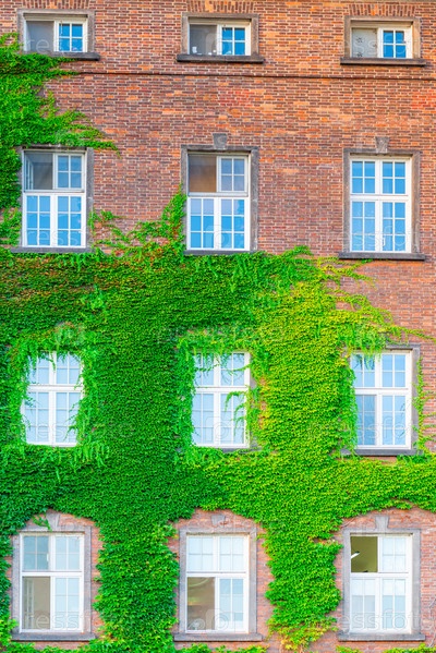 Кирпичные стены здания с окнами, заросшие плющом красивым