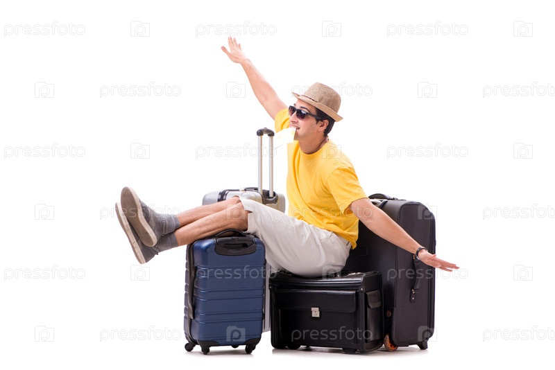Счастливый молодой человек идет на летние каникулы изолированный на белом