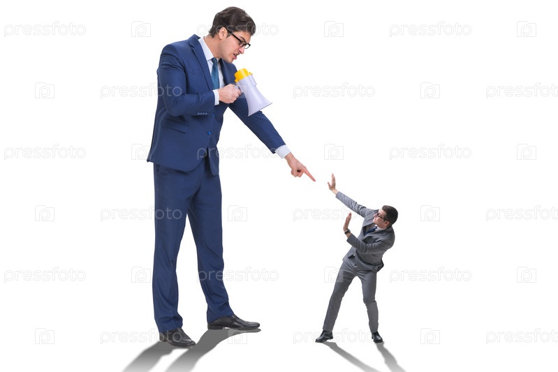 Плохой сердитый босс кричит на сотрудника с помощью громкоговорителя
