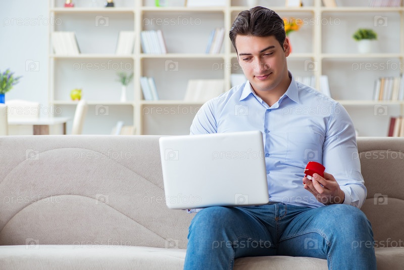 Молодой человек делает предложение о браке через интернет-ноутбук