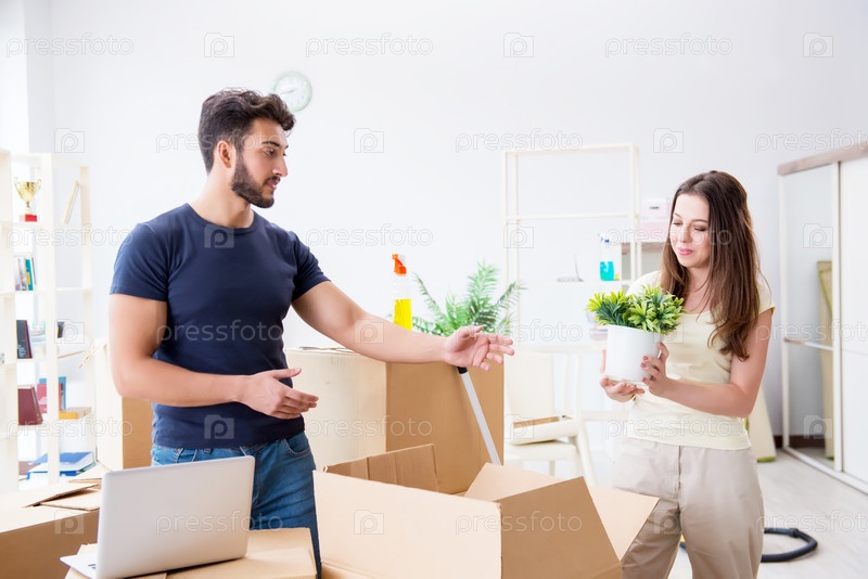 Молодая семья распаковывает вещи в новом доме с коробками
