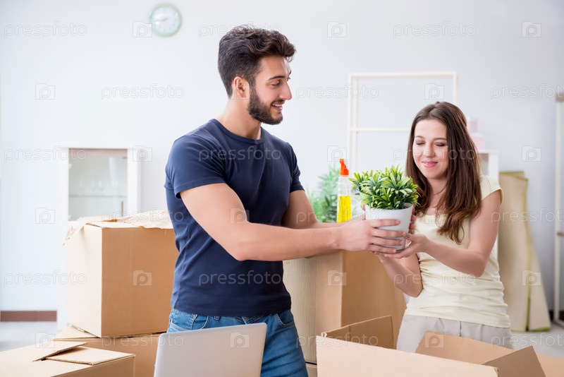 Молодая семья распаковывает вещи в новом доме с коробками