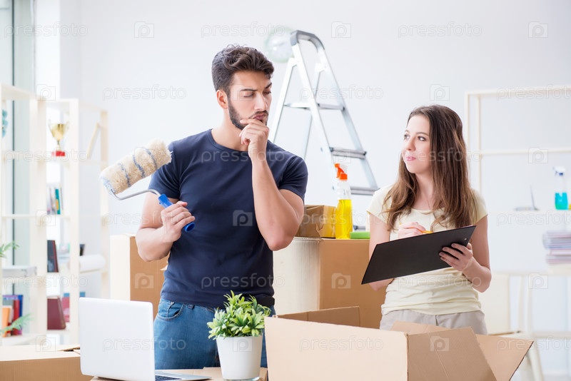 Молодая семья распаковывает вещи в новом доме с коробками