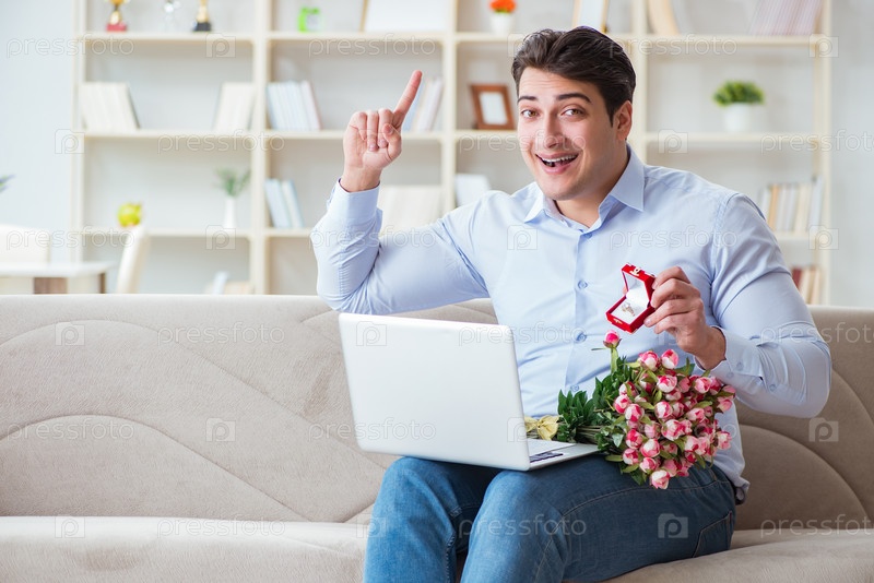 Молодой человек делает предложение о браке через интернет-ноутбук