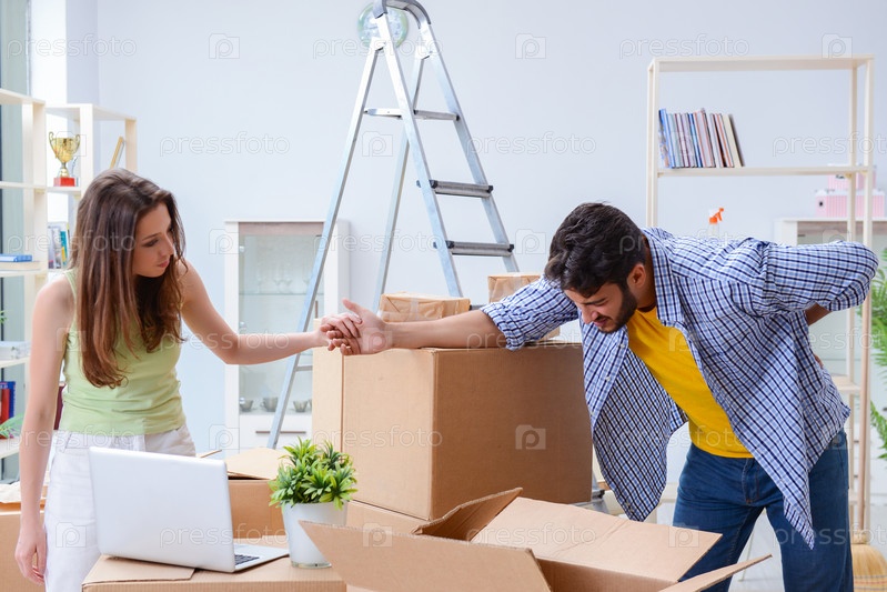 Молодая семья распаковывает вещи в новом доме с коробками