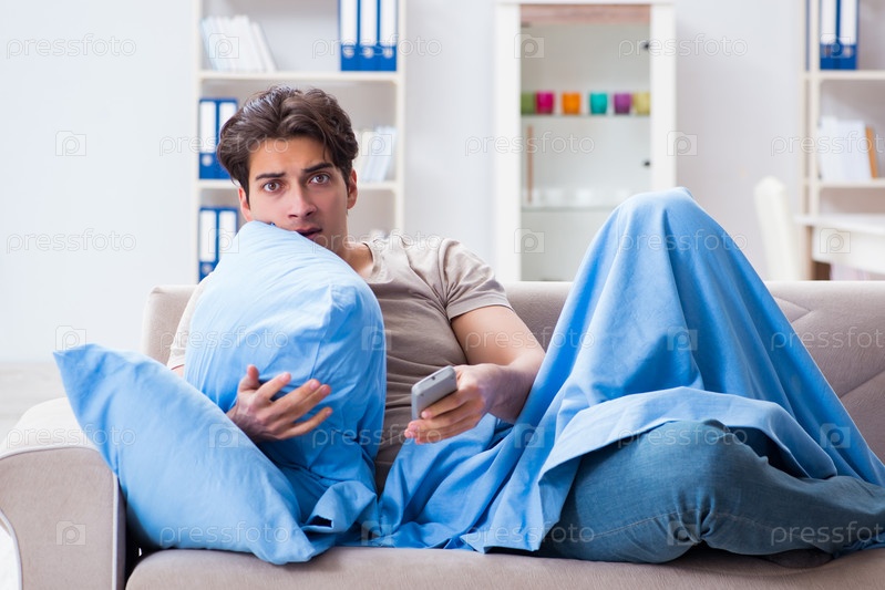 Мужчина смотрит телевизор с постели, держащий пульт дистанционного управления