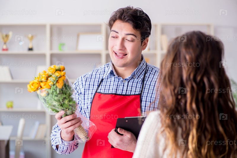 Помощник цветочного магазина, продающий цветы покупательнице