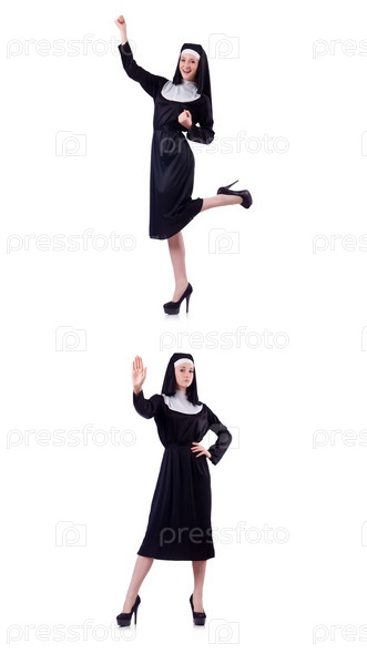 Молодая серьезная монахиня с знаком стоп изолирована на белом
