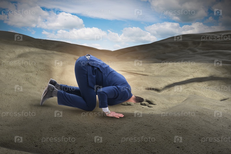 Бизнесмен прячет голову в песок, спасаясь от проблем