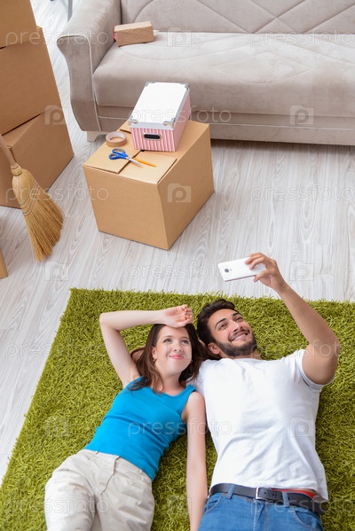 Молодая семья распаковывает вещи в новом доме с коробками
