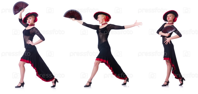 Женщина танцует испанский танец изолированно на белом