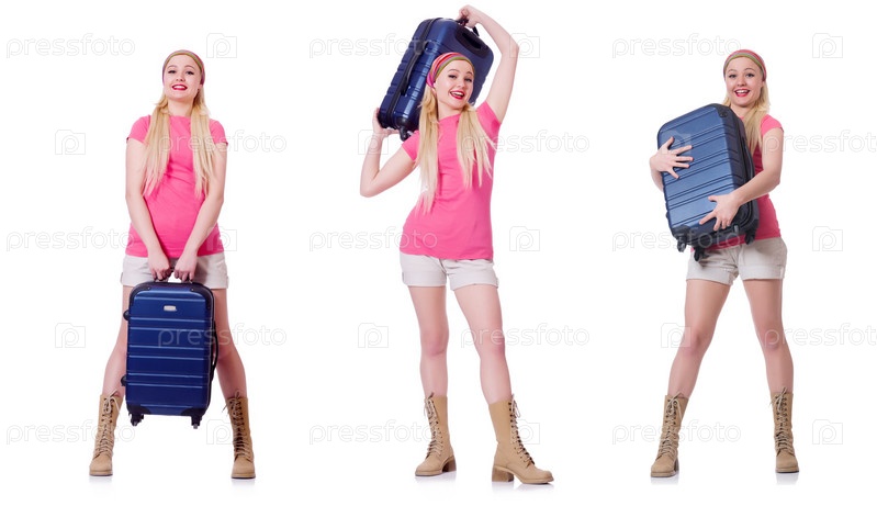 Молодая женщина с чемоданом готова к пляжному отдыху