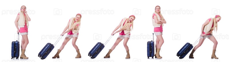 Молодая женщина с чемоданом готова к пляжному отдыху