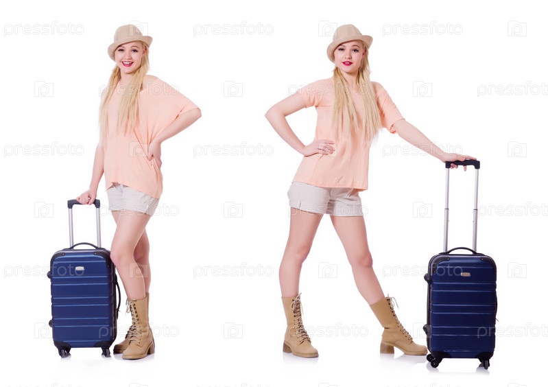 Молодая женщина с чемоданом готова к пляжному отдыху