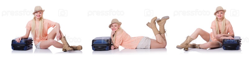 Молодая женщина с чемоданом готова к пляжному отдыху