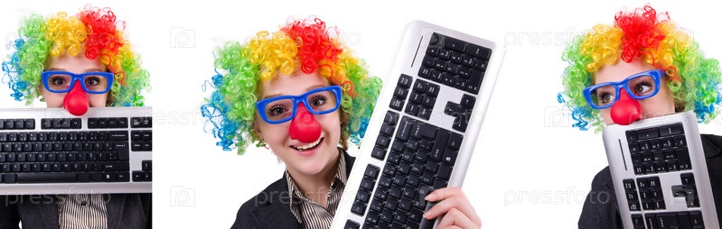 Бизнесмен с париком клоуна, изолированный на белом