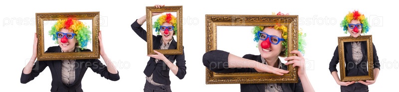 Забавная клоун-девушка с рамкой, изолированной на белом