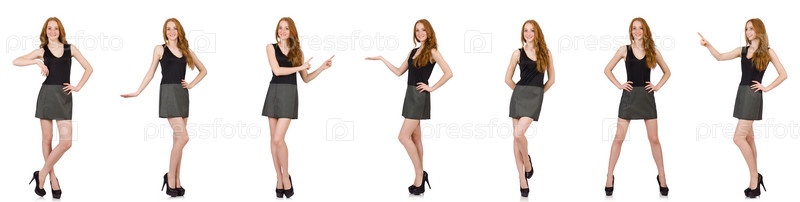 Красноволосая девушка в сером платье изолирована на белом