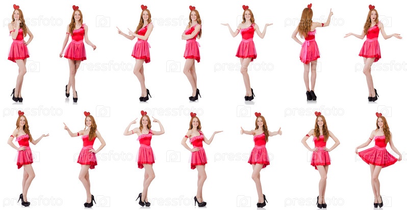 Красивая молодая модель в мини розовом платье, изолированном на белом