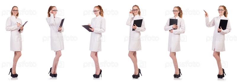 Молодая студентка-медицинская с биндером разговаривает в изолированной камере