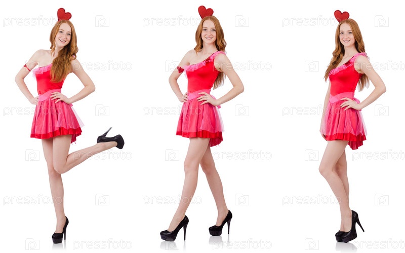 Красивая молодая модель в мини розовом платье, изолированном на белом