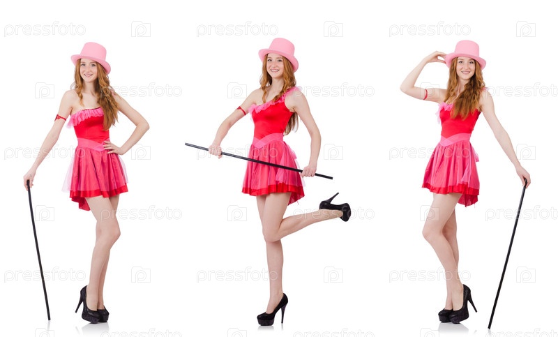 Красивый молодой волшебник в мини розовом платье, изолированном на белом