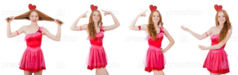 Красивая молодая модель в мини розовом платье, изолированном на белом