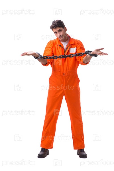 Заключенный с закованными в цепи руками изолирован на белом фоне