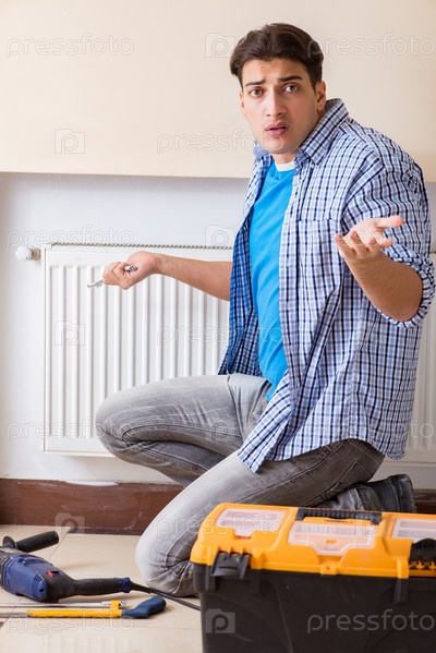 Молодой подрядчик-ремонтник ремонтирует отопительную панель
