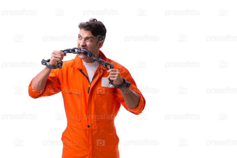 Заключенный с закованными в цепи руками изолирован на белом фоне