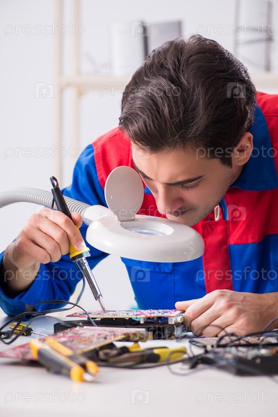 Профессиональный ремонтник, ремонтирующий компьютер в мастерской