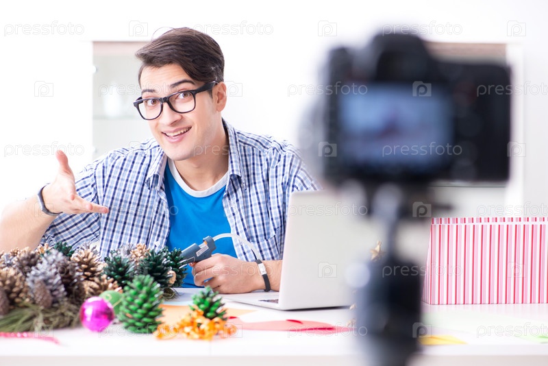 Молодой влоггер записывает видео, где он делает рождественское украшение