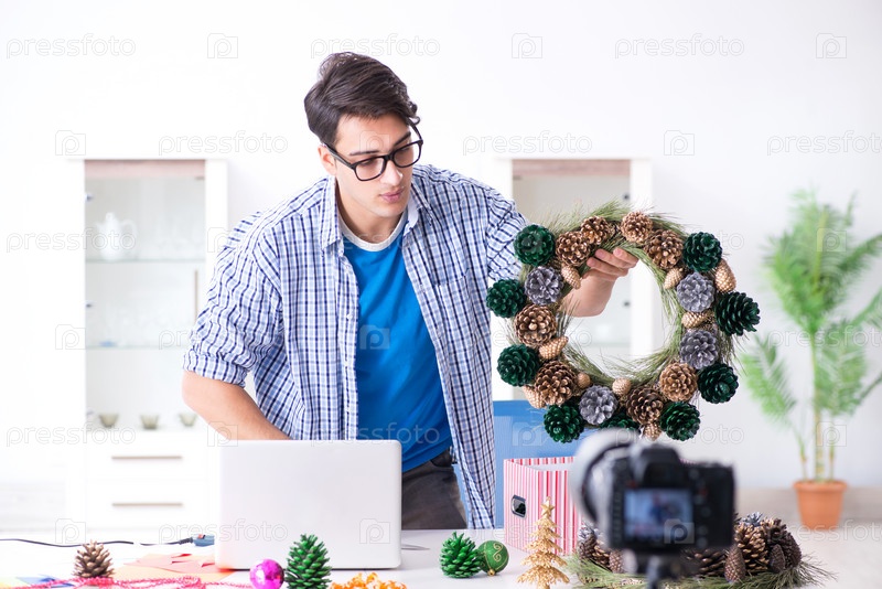 Молодой влоггер записывает видео, где он делает рождественское украшение