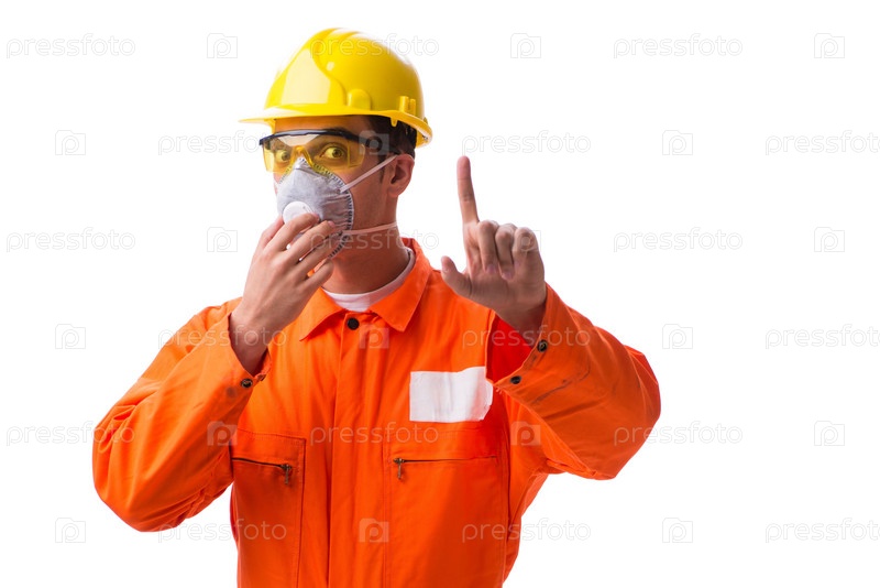 Строительный работник с защитной маской, изолированной на белом