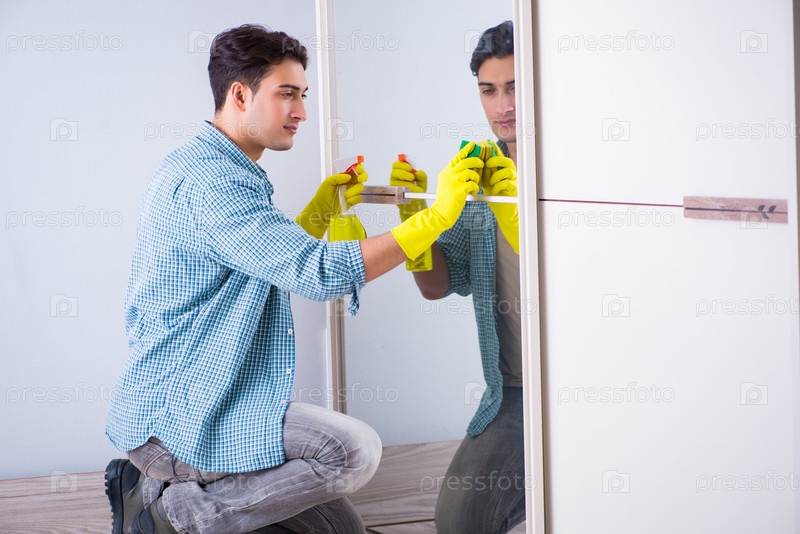 Молодой человек чистит зеркало в домашнем отеле